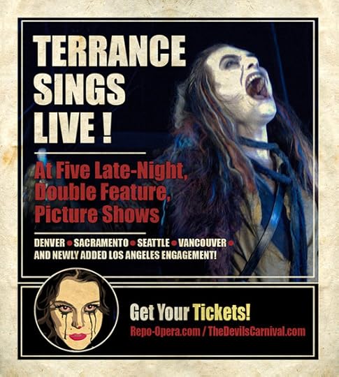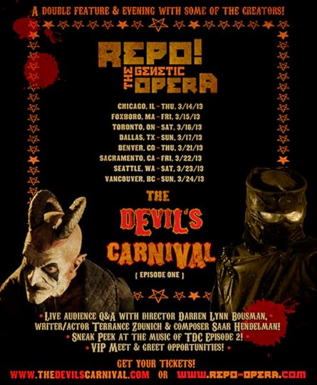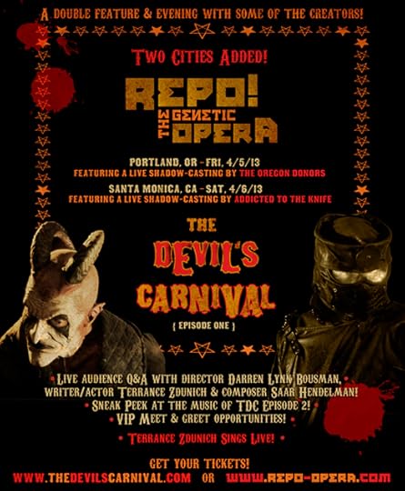 In the interim, as a tiny writing break, director Darren Lynn Bousman had the idea of hosting a handful of Repo! The Genetic Opera-The Devil’s Carnival: Episode One double features to share some of our ongoing writing process with the fans that have been so supportive of our musical endeavors over the years, as well as demonstrate how our music is then translated into film through the eye of the director.