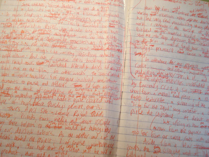 Feeling the pressure of the deadline while simultaneously wanting to create content that not only lived up to our previous works, but, hopefully, improved upon them, we began to write at a fevered pace. To put our stride into perspective, during the course of a normal year of writing, I usually fill about one-and-a-half notebooks with scribbles and sketches (note: this is no small feat, as, like a proper serial killer, my handwriting is small, stacked, and sordid). Since November of 2012, I’ve already sketched my way through two-and-a-half notebooks. On top of this, Saar and I have emailed one hundred and fifteen discrete musical ideas back and forth.