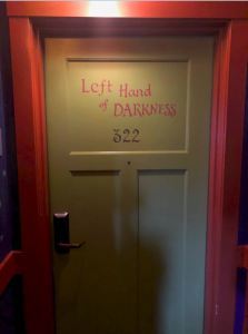 I suspect the founders of McMenamin’s group of hotels felt much the same way. Because they choose the books and the whimsical ideas that decorate their unique establishments — each of their themed rooms are specifically devoted to an idea or a writer who was important to the Mcmenamin’s founders. I was immensely gratified to find a room named after the book Left Hand of Darkness.
