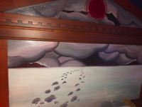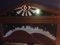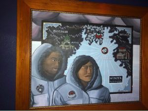 The room was even better than I’d first imagined. Instead of merely having a name on the door, and a copy of the book in the room, the Left Hand of Darkness room has small murals on the bedframes that reflect the central story of the book, of an arduous — nearly mythically hard — companionship in icy terrain on an alien planet that turns into a love affair for two gender-shifting companions.