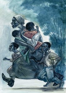 A fully dressed woman walked out of the water. She barely gained the dry bank of the stream before she sat down and leaned against a mulberry tree. All day and all night she sat there, her head resting on the trunk in a position abandoned enough to crack the brim in her straw hat. Everything hurt but her lungs most of all. Sopping wet and breathing shallow she spent those hours trying to negotiate the weight of her eyeballs. …. She had new skin, lineless and smooth, including the knuckles of her hands…. four times the woman drank from the speckled tin cup as though she had crossed a desert. (Morrison 50)