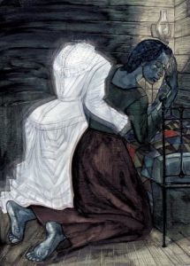 If I need to hint at the story, it’s also necessary to show how my other characters are gradually informed. Specifically, I think withholding the actual story from my readers, and allowing it to come out gradually as Sue tells it to other people, is a technique worth exploring. Morrison does this adroitly. For example, it is absolutely lovely to see how she has her characters interact with “Beloved.” They field seemingly innocuous questions and discussion, and then Morrison allows the realization of the import of those questions to land later, at the end of the discussion, so that the true meaning of that conversation reverberates backwards through the story. Here’s one instance of this technique: “Now she noticed something more. The questions Beloved asked: ‘Where are your diamonds?’ ‘Your woman she never fix up your hair?’ And most perplexing: Tell me your earrings. How did she know?” (Morrison 63). The cold realization of something unnatural – knowledge ungained from the other characters – hits the characters after the reader has already realized something is strange about the woman’s knowledge.
