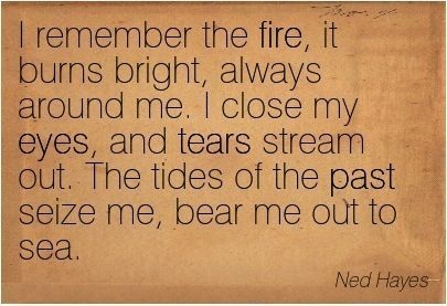"I remember the fire, it burns bright, always around me. I close my eyes, and tears stream out. The tides of the past seize me, bear me out to sea."