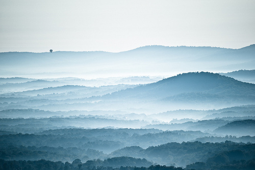 “Fog lifts in the valley, rising as mist through the bare limbed...