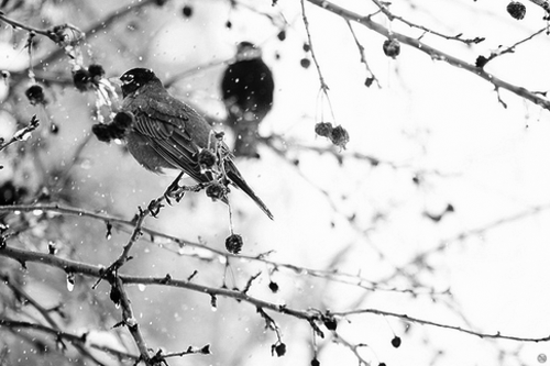 "Sound carries far here in the trees. Snow slides off a heavy oak as some creature shuffles through the woods, and ancient branches snap. Out of the corner of one eye, I see the flash of colored feathers. It is a yellowhammer, black eyes flickering in a hedgerow, tiny breast plumped out in golden livery, streaked with colors rich and brown. It was calling in its winter song: