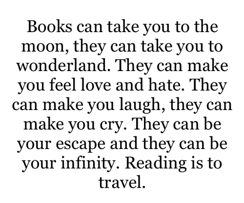 Books can take you to the moon, and they can take you to wonderland. They can make you feel love and hate. They can make you laugh, they can make you cry. They can be your escape, and they can be your infinity. Reading is to travel.