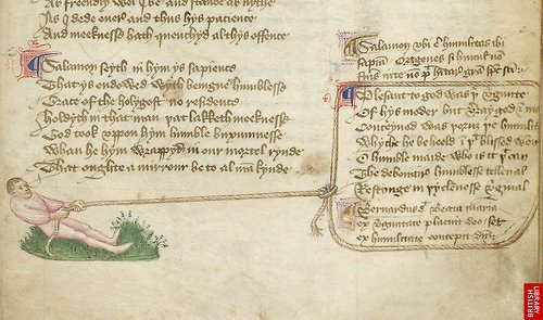 Marginal figure pulling over a block of text that was accidentally omitted from the main text. From a copy of The Regiment of Princes by Thomas Hoccleve, made in England, 1411-32 (source).