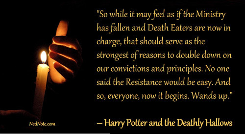 “So while it may feel as if the Ministry has fallen and Death Eaters are now in charge, that should serve as the strongest of reasons to double down on our convictions and principles. No one said the Resistance would be easy. And so, everyone, now it begins. Wands up.”