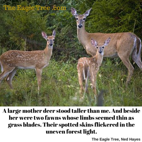 “A large mother deer stood taller than me. And beside her were two fawns whose limbs seemed thin as grass blades. Their spotted skins flickered in the uneven forest light.”
