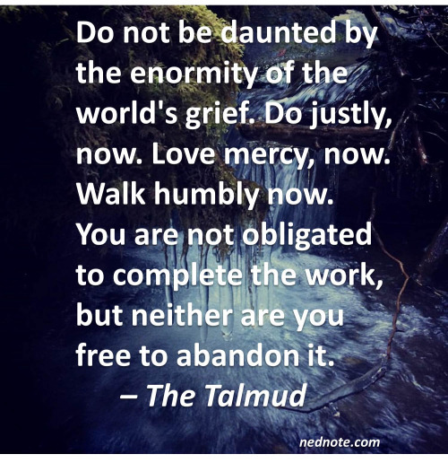 Do not be daunted by the enormity of the world’s grief. Do justly, now. Love mercy, now. Walk humbly now. ****You **are not obligated to complete the work, but neither are you free to abandon