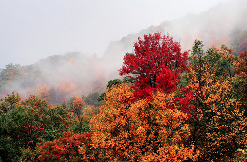 “Fog lifts in the valley, rising as mist through the...