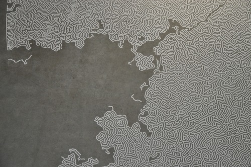 “Drawing a labyrinth with salt is like following a trace of my memory. Memories seem to change and vanish as time goes by; however, what I seek is to capture a frozen moment that cannot be attained through pictures or writings. What I look for at the end of the act of drawing could be a feeling of touching a precious memory.”
