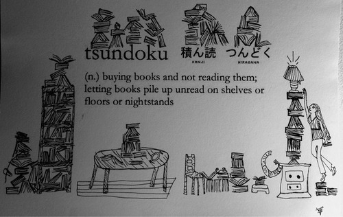In Japanese, tsundoku means, “the act of buying books and not reading them, leaving them to pile up.”
