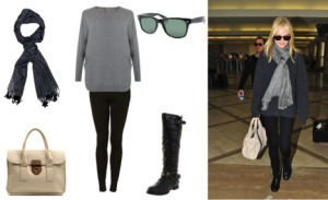 When it comes to catching a red-eye flight, comfort is key. Personally, I'm not a fan of wearing sweatpants in public — even for an overnight flight. Instead, I prefer to wear a cozy, oversized sweater with leggings, like Kate Bosworth in the photo above. This outfit looks chic, but is still very comfortable. Wear tall, knee-high boots with a pair of thick, warm socks. And don't forget to bring a pashmina, which can double as a blanket.
