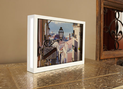 A sleek, stylish frame with a high-definition LCD screen. Can connect with WiFi, Bluetooth or cable and stream from smart phones, laptops, tablets, Flickr and Picasa. $500 Parrot.com.