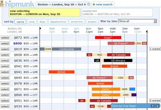 Hipmunk is flight search made easy. They've aggregated all the flights and times and packaged it into a nice viewable format so you can find the cheapest flights to match your schedule. You simply have to try it out for yourself to see how easy it is to use. With a few clicks of the button, you've found your perfect flight at the best price and it was stupidly simple. This is the first site I visit to buy my plane ticket and often, is the only site I use. Link: http://hipmunk.com