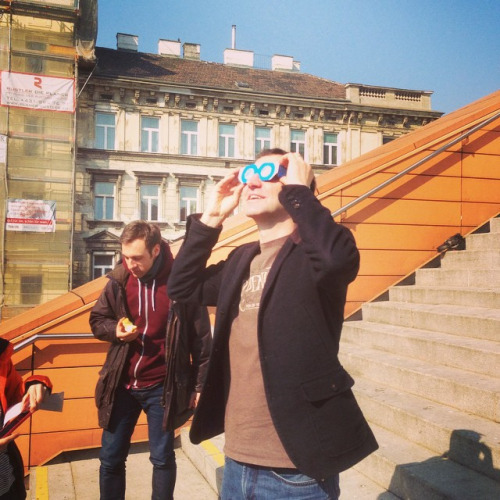 Snatching a look at the eclipse on the steps of Hauptbucherei Gurtel, Vienna.