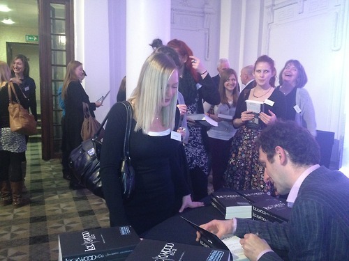 Signing copies of The Screaming Staircase proof for the Sales Conference crowd.