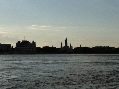 This morning I went to a Hyperion breakfast, where authors such as Rick Riordan and Mo Willems read extracts from their forthcoming titles. Then I wandered the ALA conference floor, buying too many books before going for a quick ferry ride across the Mississippi, just so I could say I'd crossed it. Into the French Quarter for dinner this evening, down lantern-lit streets laced with urgent, pleasure-seeking crowds.
