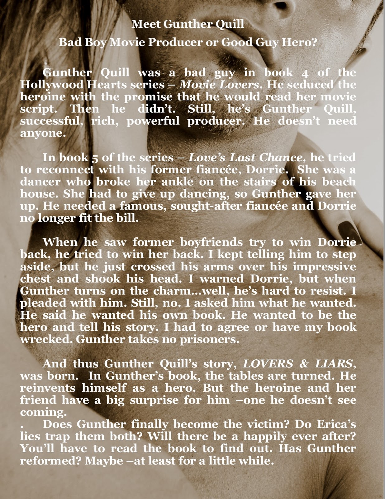 Welcome to the Bad Boy Blog Hop! I'm awarding a $10.00 Amazon Gift Card to 1 person, selected at random, who leaves their email address, and a comment. Here's my favorite bad boy -- Gunther Quill, the hero of Lovers & Liars.