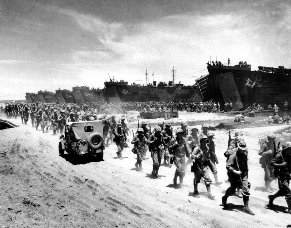 Dec. 26, 1943: U.S. Marines march ashore as they arrive in six landing crafts at Cape Gloucester on the northwestern coast of New Britain Island, New Guinea. The Allied forces made a second big invasion operation of the Japanese occupied island in an attempt to capture the big air base of Rabual, on the southwestern coast of the island. (AP Photo/U.S. Coast Guard) #