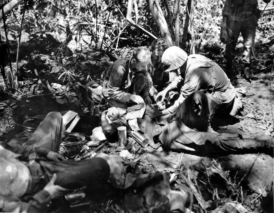 February 1944: A wounded marine receives treatment from a Navy medical corpsman at a jungle first aid station behind the lines on New Britain Island, New Guinea, in the Battle for the Strategic Japanese air field on Cape Gloucester during World War II. (AP Photo/U.S. Marine Corps) #