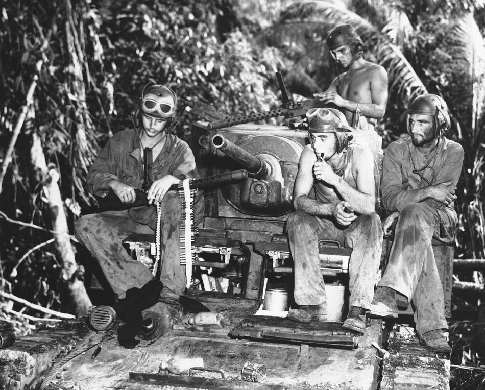 Sept. 11, 1943: After three days of fighting on the front lines on Munda, a Marine's tank crew take a rest, during which their machine guns are overhauled. This platoon wiped out 30 Japanese pill boxes. Left to right are: Pfc. Arnold McKenzie, Los Angeles, Calif.; Joseph Lodico, Sharon, Mass.; Pvt. Noel M. Billups, Columbus Ohio; and Staff Sgt. Douglas Ayres, Los Angeles. (AP Photo) #