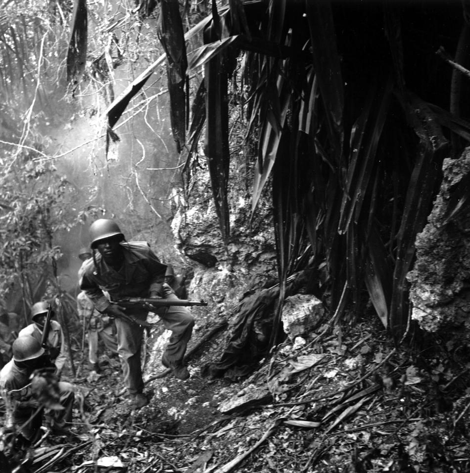 March 10, 1945: U.S. troops in the Pacific islands continued to find enemy holdouts long after the main Japanese forces had either surrendered or disappeared. Guam was considered cleared by August 12, 1944, but parts of the island were still dangerous half a year later. Here, patrolling Marines pass a dead Japanese sniper. These Marines may belong to the Fifty-second Defense Battalion, one of two black units sent to the Pacific. (Charles P. Gorry, AP Staff/AP Archives) #