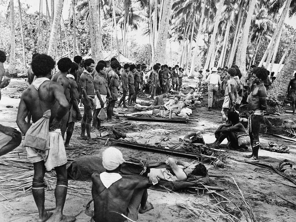 Jan. 21, 1943: Native stretcher bearers rest in the shade of a coconut grove as they and the wounded American soldiers they are carrying from the front lines at Buna, New Guinea take the opportunity to relax. The wounded are on their way to makeshift hospitals in the rear. (AP Photo) #