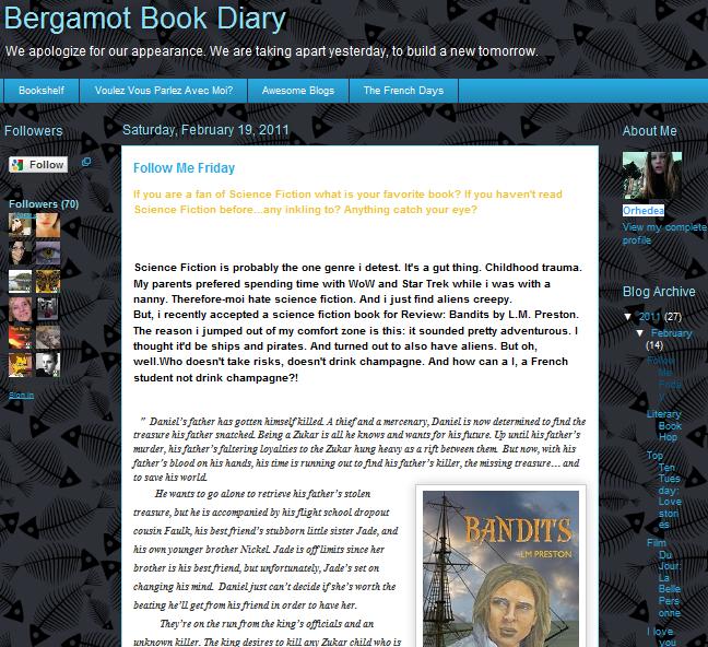 Please drop into her blog and say hello. I hope she likes it since she isn't into Scifi, but BANDITS is a character driven story, a coming of age, and a life changing story in a scifi/fantasy world of sorts. So I'm crossing my fingers she loves it.