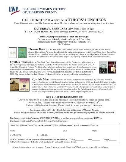 Join me and Denver authors Eleanor Brown and Cynthia Swanson for the League of Women Voters of Jefferson County Authors’ Luncheon. I’ll be sharing stories about a passion for reading and writing books. This is going to be fun!