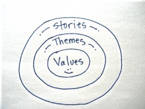 2. Identify the themes or topics that keep recurring in your writing and match them with values, then find stories that express those values.