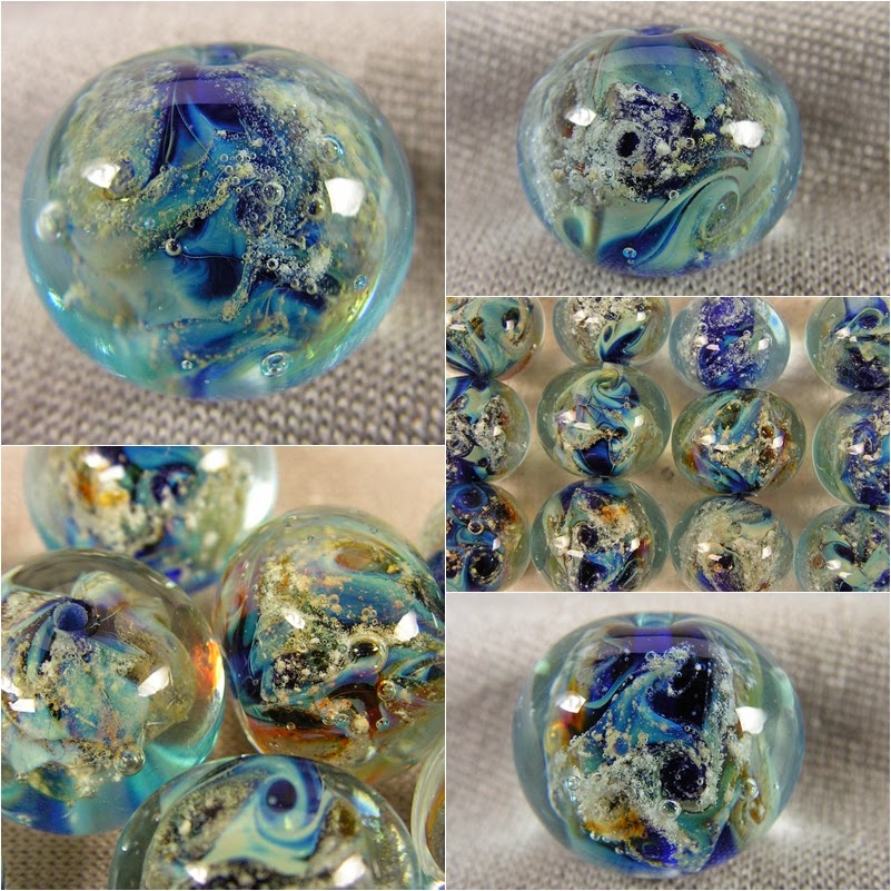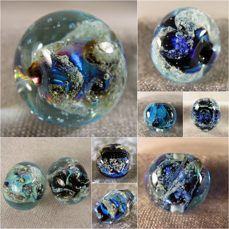 I've recently developed a 2.0 version of this bead - using a transparent cobalt core for the base puts a little more "blue" into the bead. The following collage shows how these beads turned out. The client I made them for is absolutely thrilled. What's your opinion of the 1.0 (black base) versus the 2.0 (cobalt blue base)?