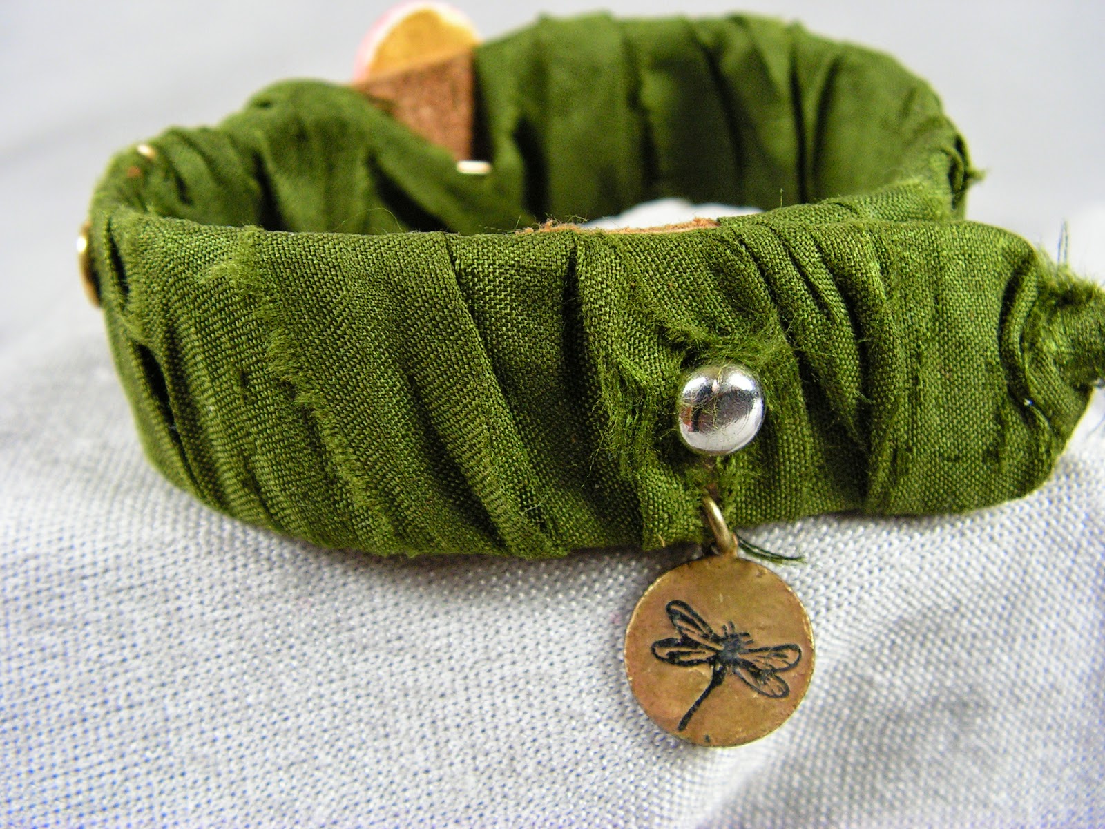 The bracelet is based on a pre-made leather cuff, wrapped in recycled sari ribbon. The cuff came with a few holes in it, but I added *lots* more so I could affix the focal and embellishments. I was lazy and didn't want to dig out the Dremel, so I used a center punch on each hole a few times, then used an old needle file to ream out the hole. The beauty of the lazy strategy is that you can make each hole a different size to accommodate different elements, yet you don't need to switch out drill bits. Lazy *and* clever, no?