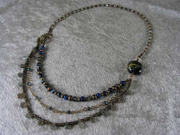 This one features the afore-mentioned lovely labradorite briolettes with tiny holes, as well as some smaller blue rondelles that Christine sent, the brass rounds and dyed impression jasper, and one of my own handmade lampwork Nebula Series beads in a dark oceany blue. I used one of the "woven" round links Christine sent as part of the clasp, with a brass S-hook for the other part - had to bend the S-hook though, so it would lay properly.