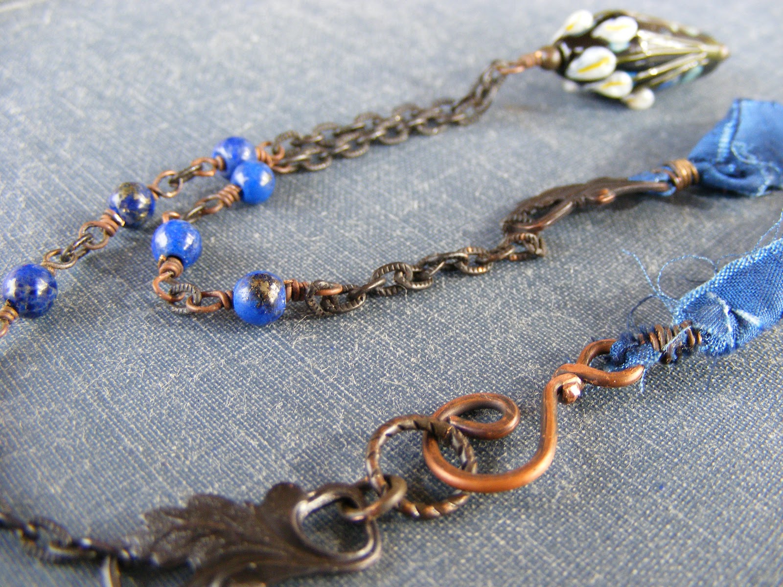 From my stash came a few indicolite Swarovski crystals, short lengths of chain rescued from the thrift shop, and a handful of my own lampwork beads. It was *really* tricky to match the blue of the pendant, so I finally gave up on an exact match and just went with pretty blue beads in hues that complement the focal and bring to mind the dragonfly’s pond. I used a few of Christie’s silver beads, but left out the ivory pearls.