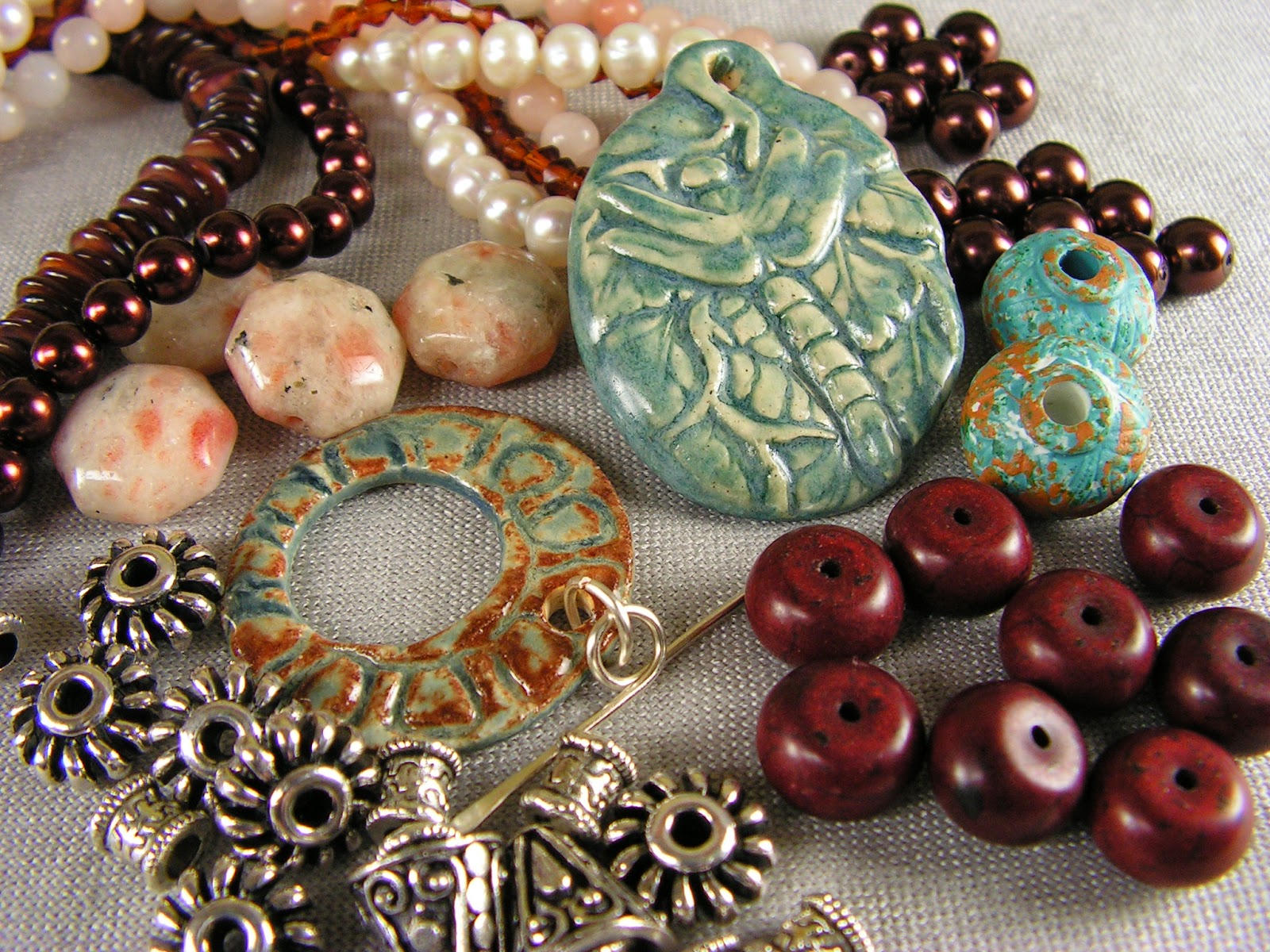 focals including wooden tiles from JLynn Jewels and Skye Jewels, ceramic focals