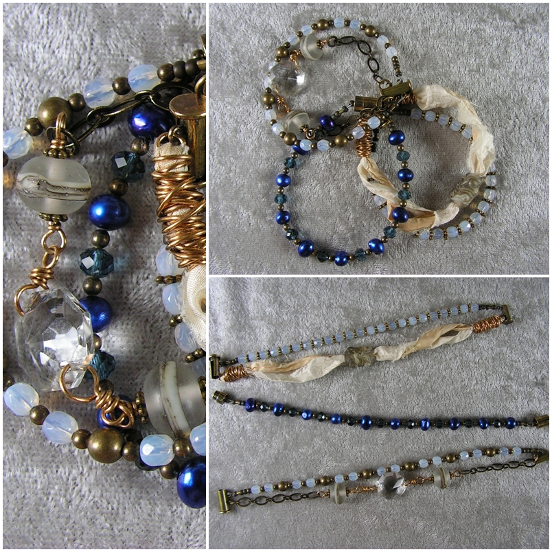 The first bracelet features one of the four vintage chandelier crystals that Christine sent me, which I combined with two of my etched lampwork beads, brass chain, some milky white faceted Czech beads and some of Christine's brass rounds. The second bracelet is very simple, but I love it: Christine's bright blue freshwater pearls and more of those yummy blue faceted rondelles (have I mentioned lately how much I LOVE faceted rondelles? No? Well, I *do* love them!). The third bracelet incorporates mixed media - wire, recycled sari silk fiber, one of my Desert Dreams series lampwork beads, and more of those great milky Czech faceted beads, with some cool brass spacers. I suppose you *could* wear just one bracelet at a time, but so far, I've worn all three bracelets together - I think they are happiest that way.