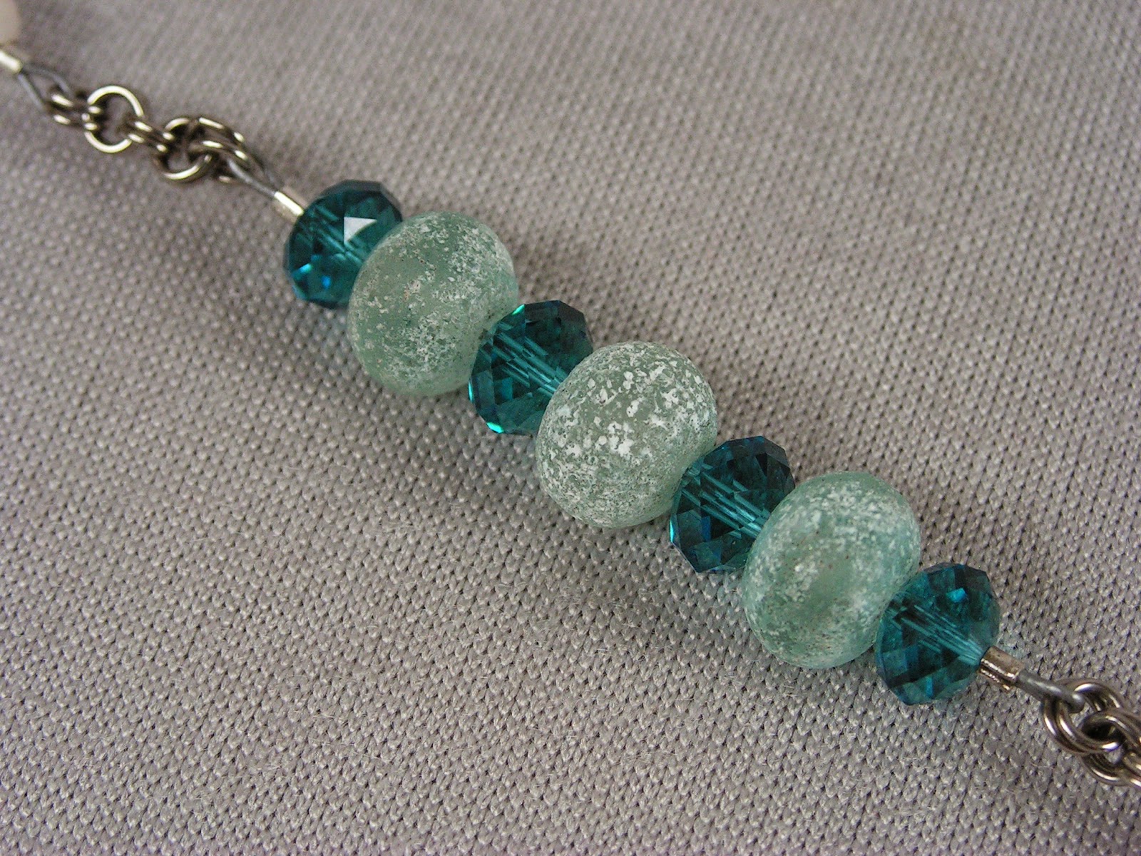 I decided to play up the blue and brass tones, so I found some great brass chain at Shipwreck Beads, and dangled Christine's lovely blue rondelles from every third link. On the other side, I used some of my etched handmade lampwork beads in a "brassy" color (transparent light brown) and strung them with a bead soup mix I already had on hand from a prior project. (A while ago, I used this same color scheme on a lanyard, and I really like it - it's elegant and stylish without being fussy.)