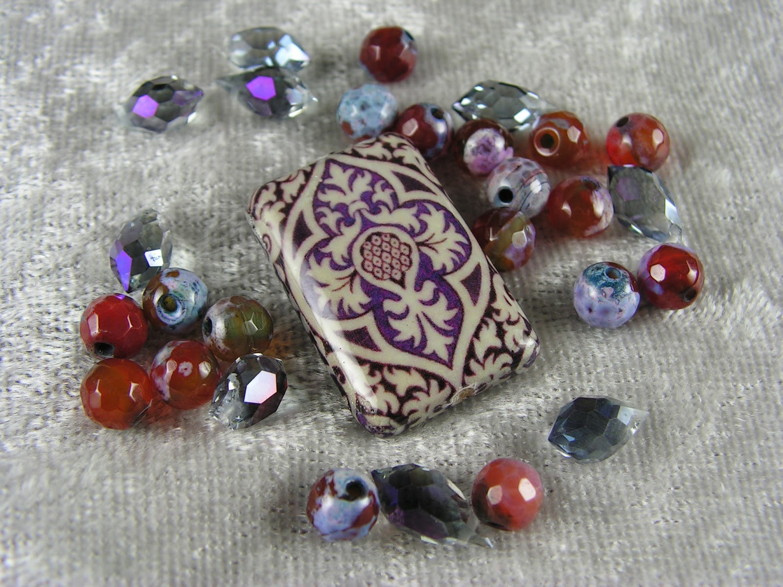 The second soup Christine sent has a purple/red/blue color scheme - the focal is a decoupage tile, which I just love, accompanied by dyed red and blue agate beads, and some gorgeous sparkly blue/grey brolette drop crystals for some serious bling. I've decided to use gunmetal findings with this color scheme - hoping I get this piece finished before the big reveal!