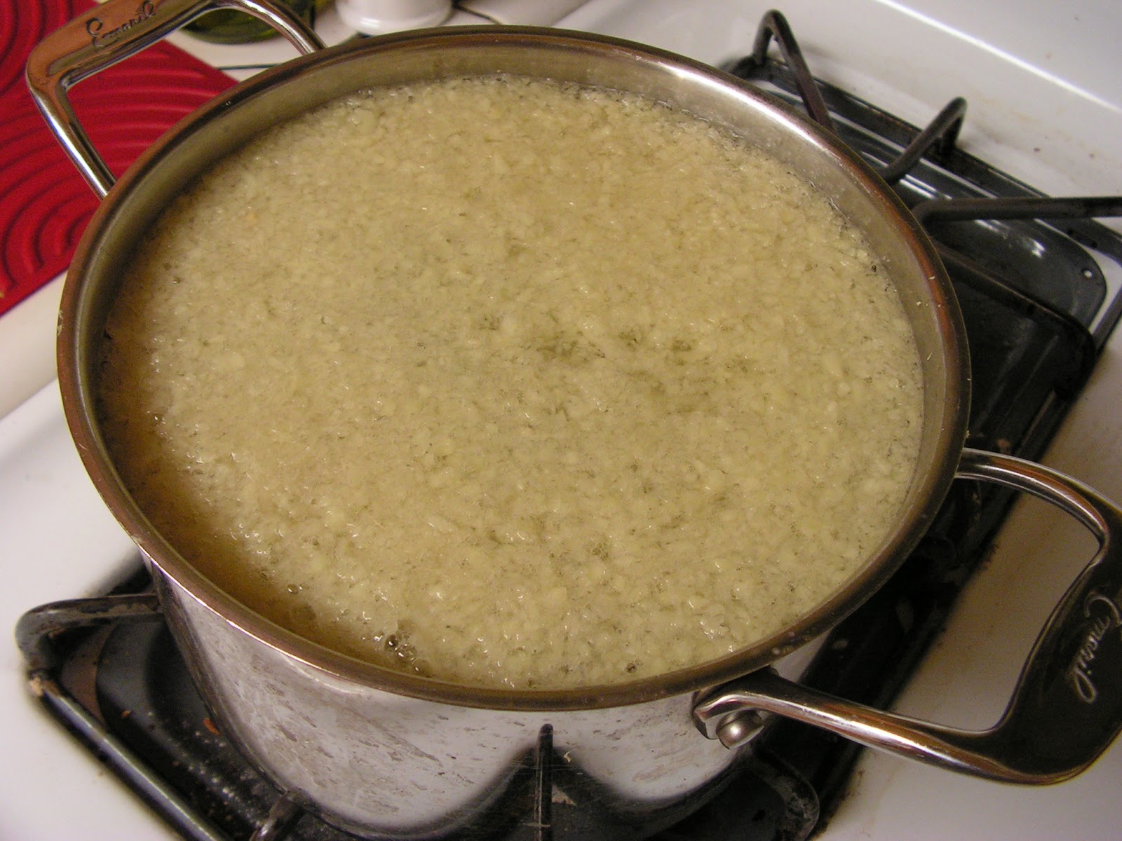 This is a 3-quart pot, filled with water and brought to a boil. Add chopped ginger and re-heat, just shy of a boil.