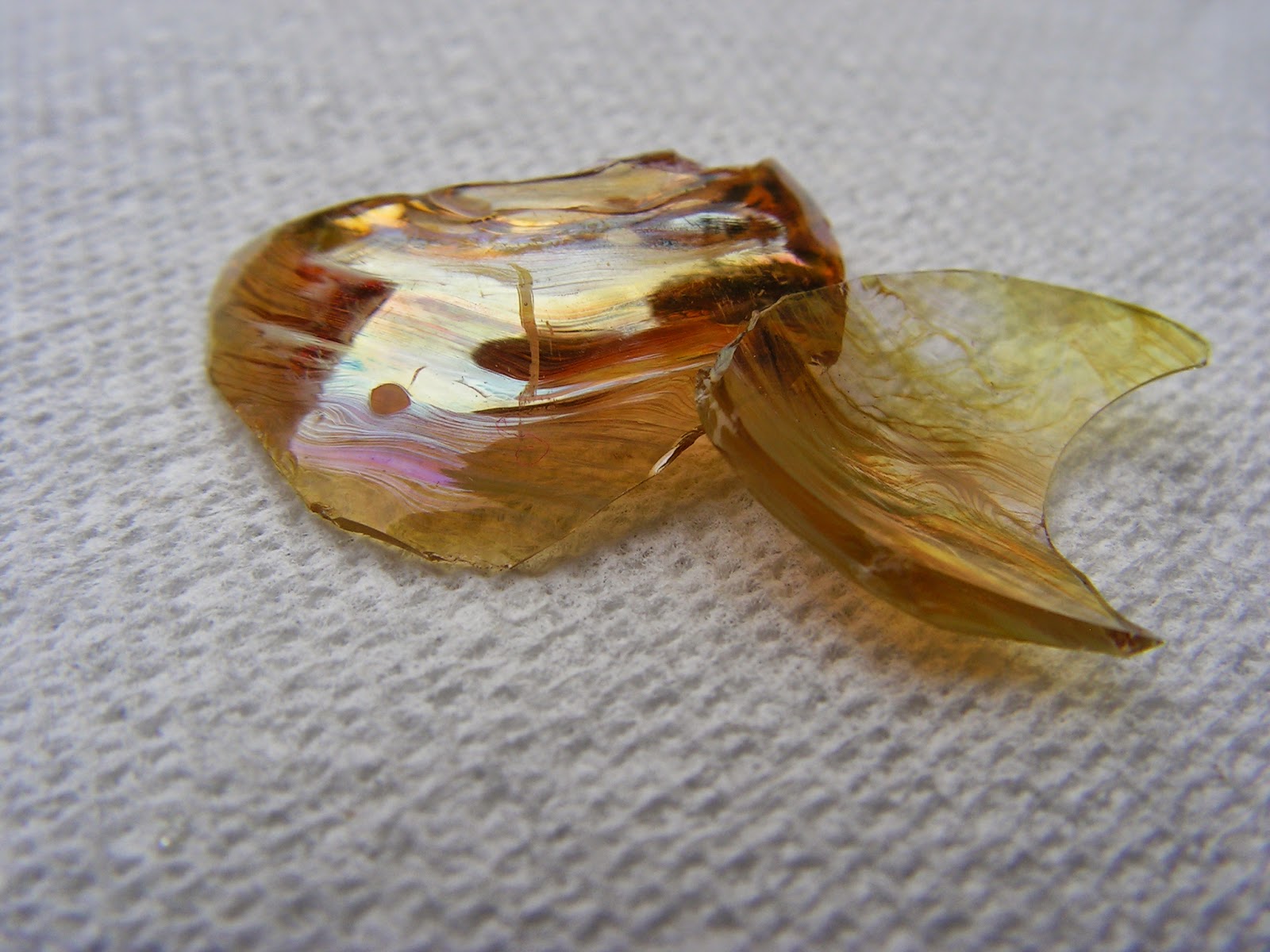 This is the same glass, but in shard form - which means I make a bubble of the pink glass, and blow it out, let it cool, and then break it into pieces, which are called "shards." The piece on the left shows a really shiny patch on the surface - that is the metals in the color coming to the surface of the glass, and is part of what makes the magic of the blue color on the Galaxy beads.