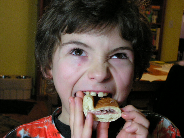 My goofy youngest childebeast scarfs a ham & vegan mozz hot pocket.