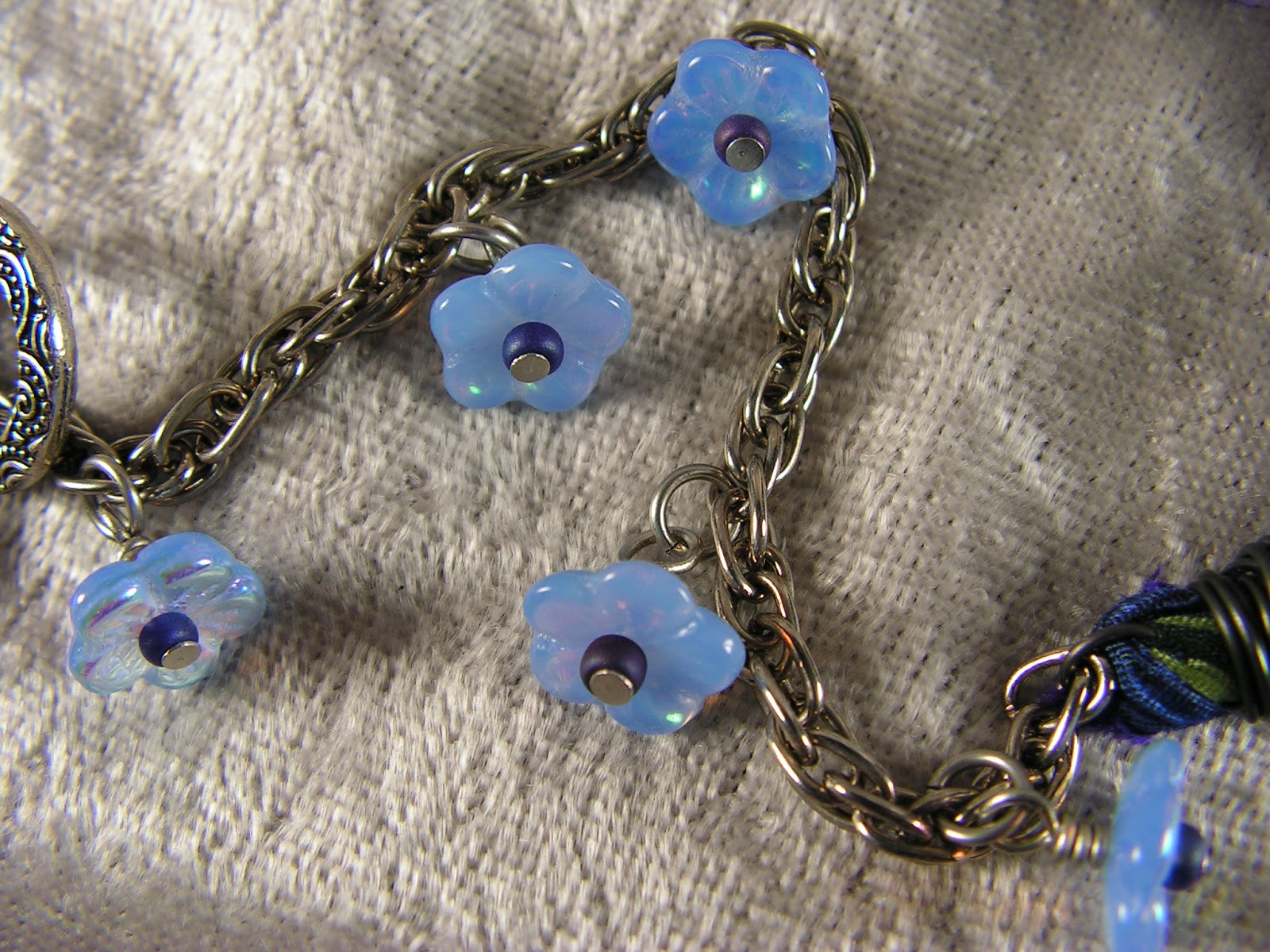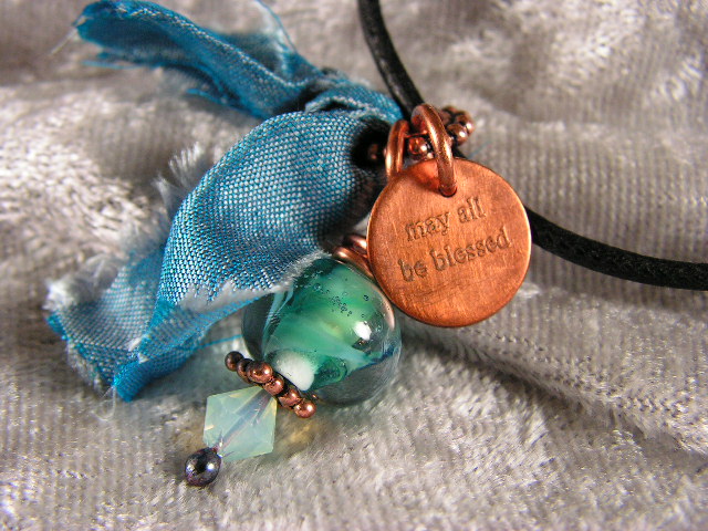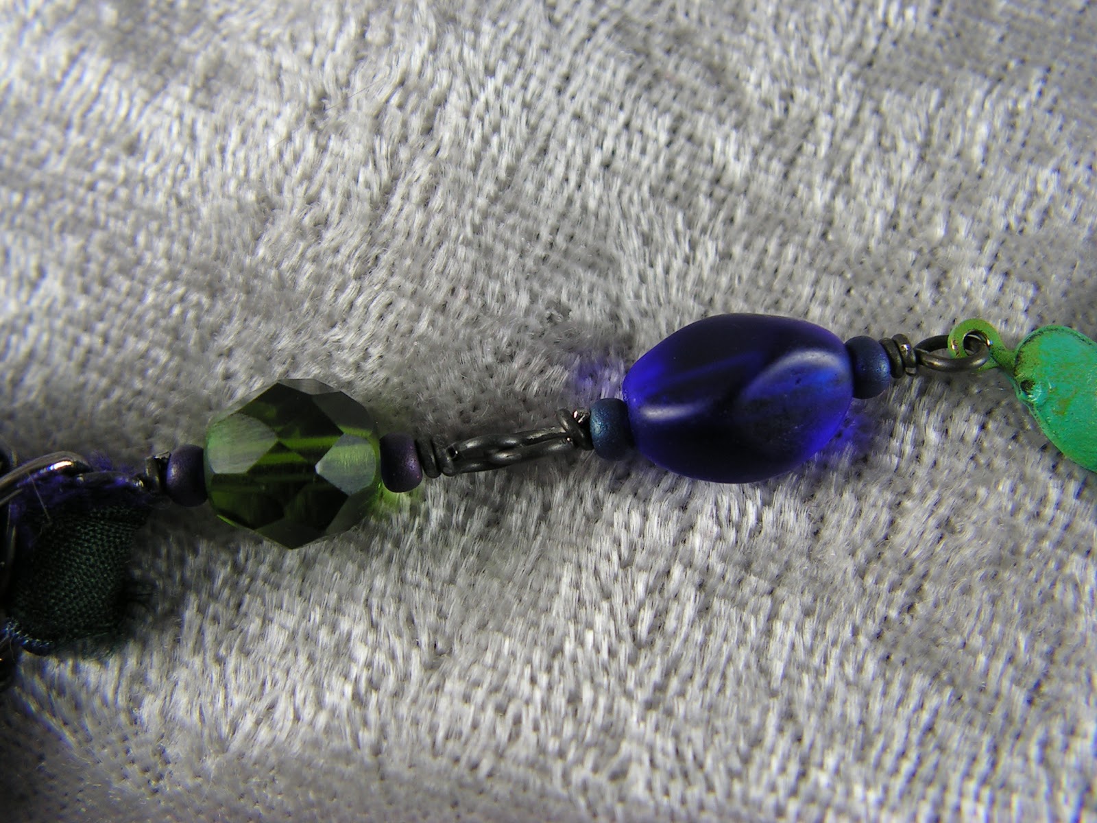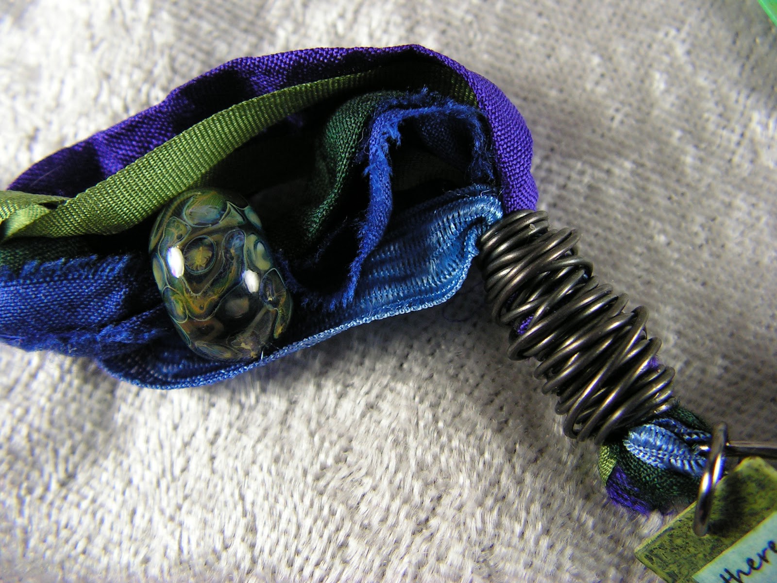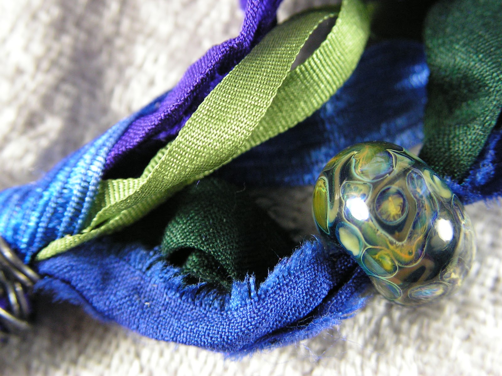 The center of the ribbon section features one of my lampwork beads strung onto the blue and green sari ribbons - I love how this turned out, and I think I'll make more lampwork beads with holes big enough to fit multiple ribbons. :)