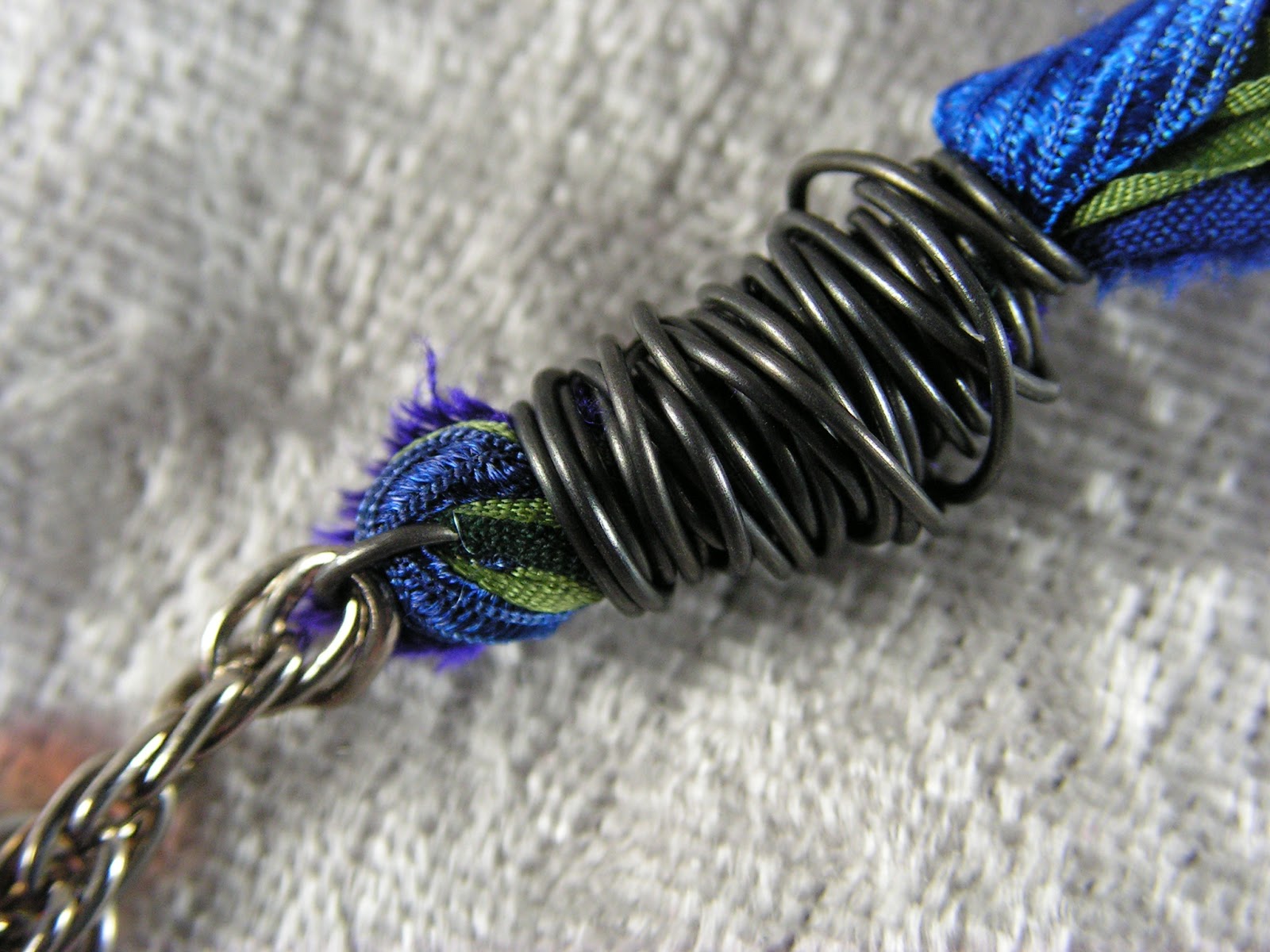 Ribbons and recycled (fair trade!) sari silks wrapped with 19 ga. annealed steel wire & connected to upcycled necklace chain.