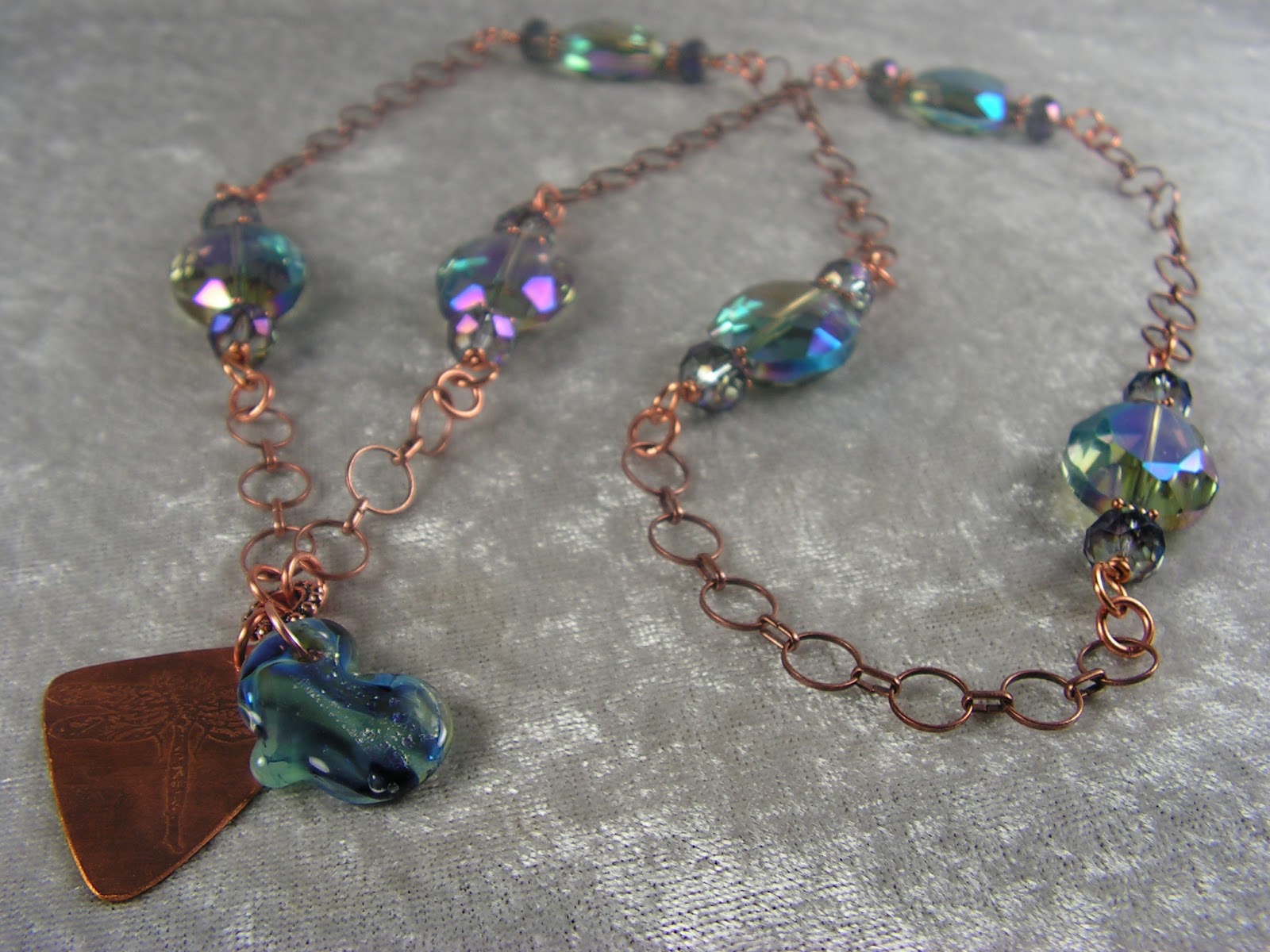 Chain Reaction Necklace with etched copper tag and lampwork glass heart, all by C. Hansen, class sample