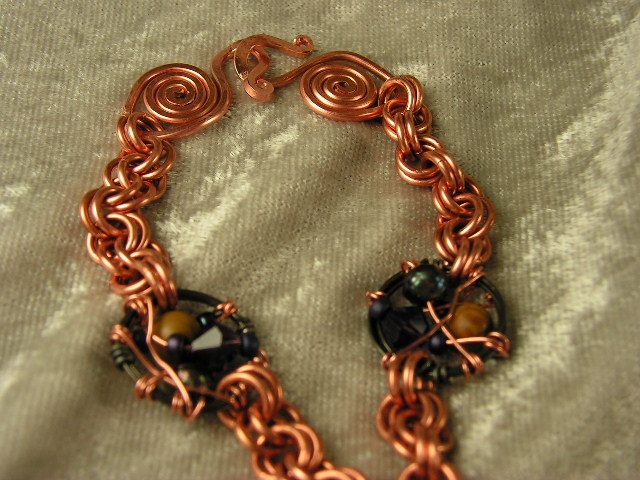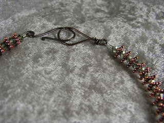 OK, that works, but what about the clasp? It needed to be as substantial as the rest of the necklace. Sharilyn Miller's book, Bead on a Wire, came to the rescue – I made two of her big spiral hooks, and shaped them so they would hook together and lay nicely against the back of the neck.