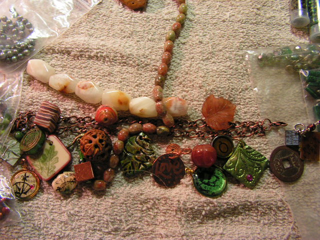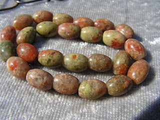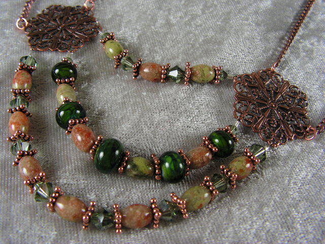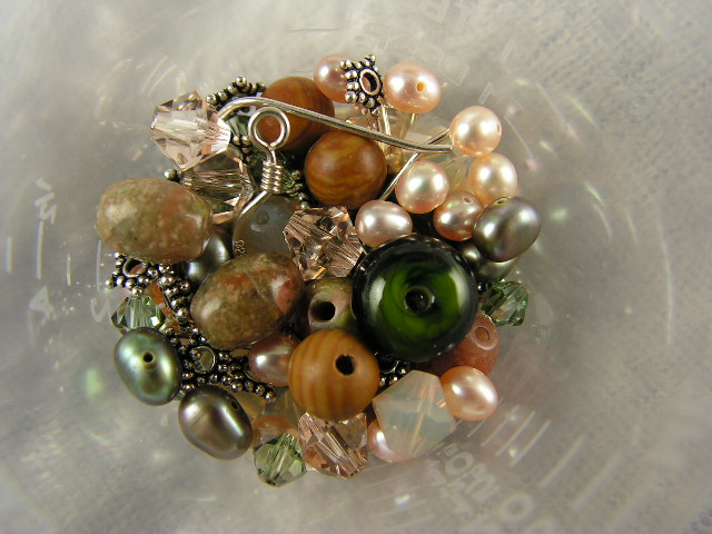 Playing on the olive and peachy tones in the jasper and bowenite beads works too!
