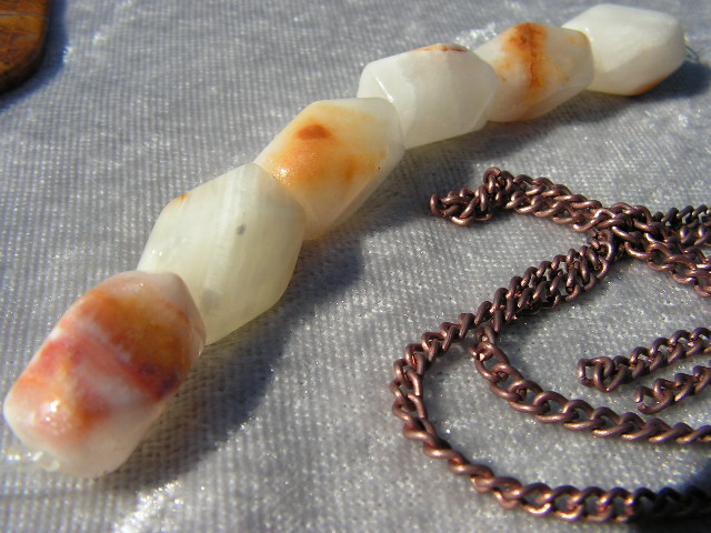 And you are going to be amazed! Ambra sent me a gorgeous bamboo agate focal bead, along with chunky faceted bowenite beads and softly mottled jasper beads. Ambra also sent me a length of copper chain, two coppery filigree stars, and an elegant copper clasp that she made herself (which I think is the very coolest – I'm such a handmade dork, I know, right?).