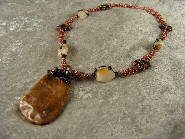 I decided for a focal this big and gorgeous, the rest of the piece needed to big and gorgeous too, so I made sections of 2x2 chain (good thing I had a stash of copper jump rings, no?).